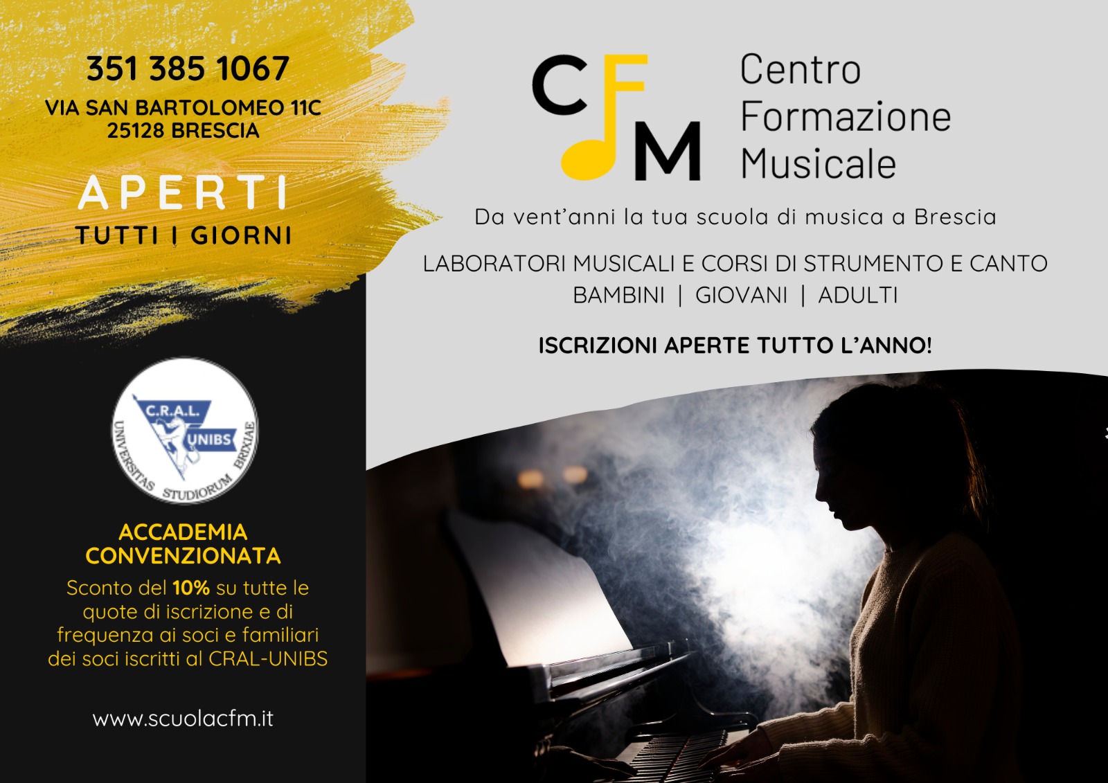 La convenzione, rivolta agli iscritti al CRAL-UNIBS e ai familiari (coniugi, genitori, fratelli, figli e nipoti) include uno sconto perpetuo del 10% su tutti i corsi e laboratori di musica compresa la quota annuale di iscrizione, cumulabile con altre scontistiche e promozioni previste dalla Scuola.
