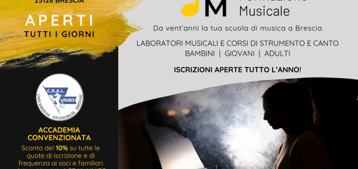 La convenzione, rivolta agli iscritti al CRAL-UNIBS e ai familiari (coniugi, genitori, fratelli, figli e nipoti) include uno sconto perpetuo del 10% su tutti i corsi e laboratori di musica compresa la quota annuale...